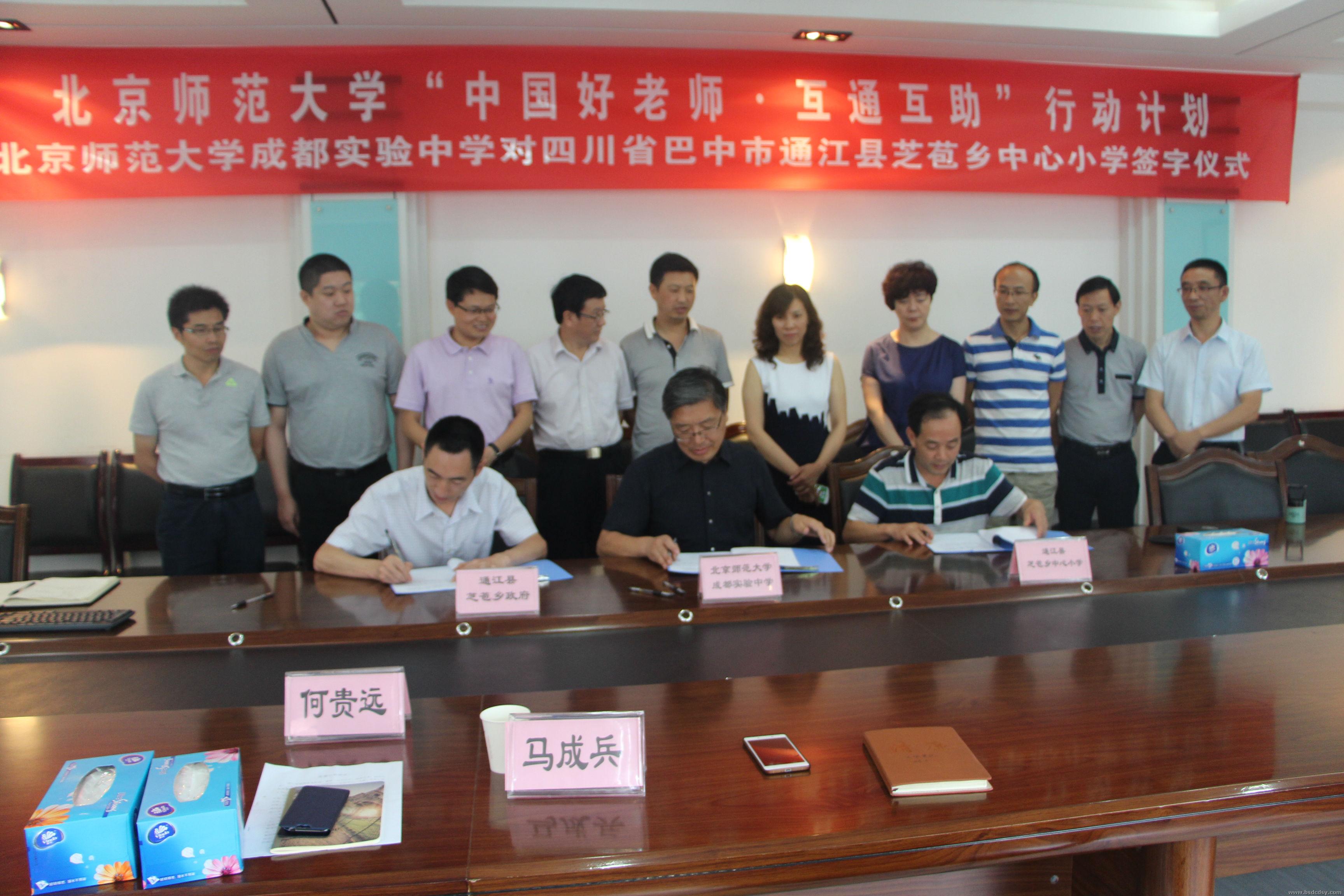 为落实教育部《关于统筹推进城乡义务教育一体化改革发展的若干意见》,推进“中国好老师”行动计划,2016年7月9日,北京师范大学成都实验中学对四川省巴中市通江县芝苞乡中心小学“互通互助”签字仪式,在学校拓新楼三楼会议室隆重举行。支援方,北京师范大学成都实验中学行政班子全体到会,刘增利校长就“互通互助”项目的意义、支援方应有的责任进行了诚恳的说明,张文勇副校长对学校情况进行了介绍;受援方,四川省巴中市通江县芝苞乡张涛乡长、乡中心小学何贵远校长、乡中心小学马成兵副校长,出席签字仪式。