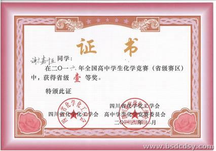 去年8月28日,在陈新、陈莉两位老师的带领下,我校高寒等十二位同学参加了由中国化学学会主办的2016年第30届中国化学奥林匹克初赛,在高手云集的激烈竞争中,通过激烈的比拼,最终高寒同学获得三等奖,得到了中国化学学会的表彰。除此之外,谢浩宇、龙介峰、谢嘉恒等三位同学获得四川省一等奖。周持盈、钟志琦、张雷、王欣等四位同学获得了四川省二等奖,袁祎杰、李昊燊、刘涛荣、王睿杰等四位同学获得了省三等奖,他们都得到了四川省化学化工学会等单位的表彰。陈新、陈莉两位老师也获得了“优秀指导教师”的奖励。