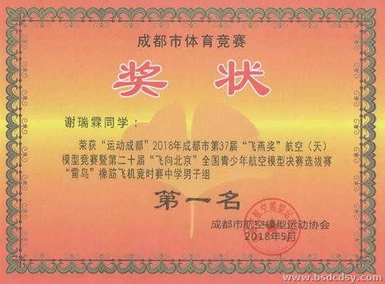 在“运动成都”2018年成都市青少年第37届“飞燕奖”航空(航天)模型竞赛暨第二十届“飞向北京”全国青少年航空模型决赛选拔赛中,我校凌锡帮老师带领的学生团队取得了骄人的成绩,荣获成都市航空模型运动协会颁发的优秀组织奖,同时荣获“天驰”橡筋飞机竞时赛中学组团体一等奖。参加比赛的何一功、姚雨霖、谢瑞霖、谢天麒、张智凯、陈嘉信、叶呈焦等七位同学在五个个人项目中成绩喜人,共获得第一名四个,第二名三个,第三名两个,第四名一个,第六名一个,第七名一个。凌锡帮老师荣获优秀辅导员奖。
