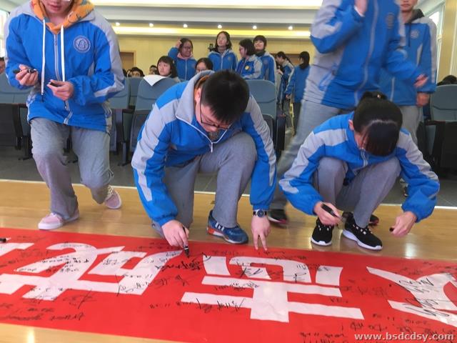 接着,年级分管领导张文勇副校长发表讲话,他在讲话中高度肯定看高2016级全体师生甘于奉献、勇于拼搏的精神,并高屋建瓴地指出目前面对的严峻形势,强调高三这一年中同学们要夯实基础、坚持不懈,务必拿出高三学子应有的精气神,以龙争虎斗的气概挥洒青春。讲话完毕,同学们分批上台,在众志成城,谁与争锋的横幅上庄严写下自己的名字,一笔一画,无不坚定青春的信念与必胜的决心。
