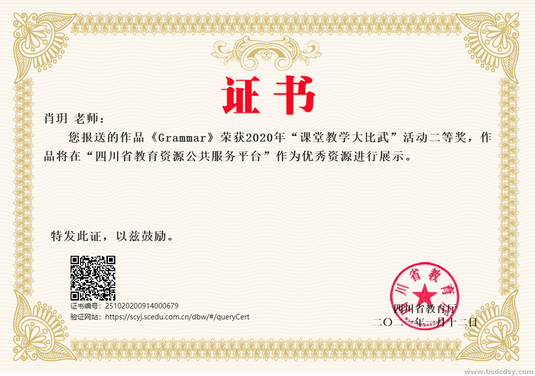 在以“服务教师,提升‘晒课’质量;融合创新,落实减负增效;总结经验,宣传典型案例”为宗旨的四川省2020年“课堂教学大比武”中,我校老师携带近十年的学思课堂研究成果,积极参加了此次大比武活动。继在成都市初赛中取得完课评比一等奖4个、二等奖12个、三等奖17个,微课评比二等奖6个、三等奖10个的好成绩后,我校推送的肖玥老师的《Grammar》一课,经过晒课和专家评委评审两个环节的比拼,最终在强手如林的省级大赛中,以精细的课堂设计,完美的导学导思的教学过程,获得了专家评委的好评,荣获了四川省2020年“课堂教学大比武”活动二等奖,作品将作为优秀资源在“四川省教育资源公共服务平台”进行展示(https://scyj.scedu.com.cn/dbw/#/workDetail?id=523644669427855360&from=workList&pathKey=works)。
